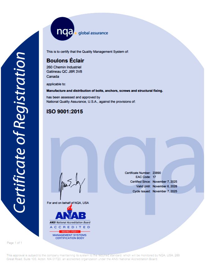 Le département de fabrication de Boulons Éclair demeurera pleinement opérationnel pendant les vacances de la construction, du 20 juillet au 2 août 2025 inclusivement.