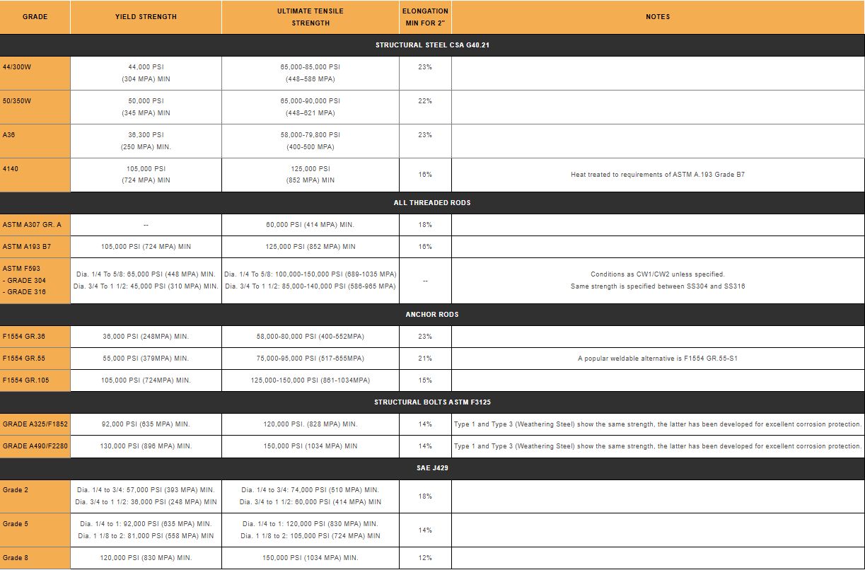 We’ve compiled this quick-reference chart to guide decisions on yield strength, tensile strength, and elongation across common structural, threaded, and anchor-grade fasteners.